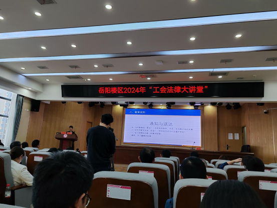 4月23日上午,岳阳楼区总工会主办,区妇幼保健院协办的岳阳楼区2024年“工会法律大讲堂”活动在区妇保院学术报告厅举行,岳阳楼区总工会女职工委员、各街道(乡)工会主席、部分区直单位工会主席、重点企业工会负责人、区总工作人员等100余人参加。活动旨在增强全区工会工作者法律意识,做好依法维护职工合法权益的法律宣传普及工作。