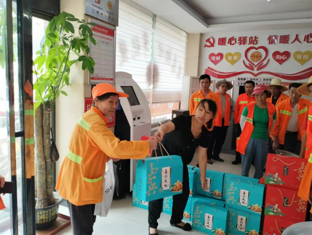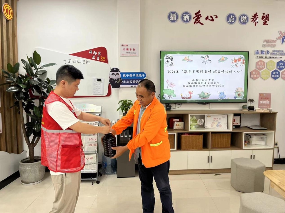 6月4日,庙前街社区工会联合会在社区暖心驿站组织开展“情暖端午节 爱献环卫工”慰问活动。活动现场,社区工会志愿者们将精心准备的慰问物资送到一线环卫工人和外卖送餐员手上,并与他们亲切交流,仔细询问他们的工作情况和身体状况,叮嘱大家在即将到来的高温天气里要做好防暑工作,欢迎他们常来暖心驿站歇歇脚。