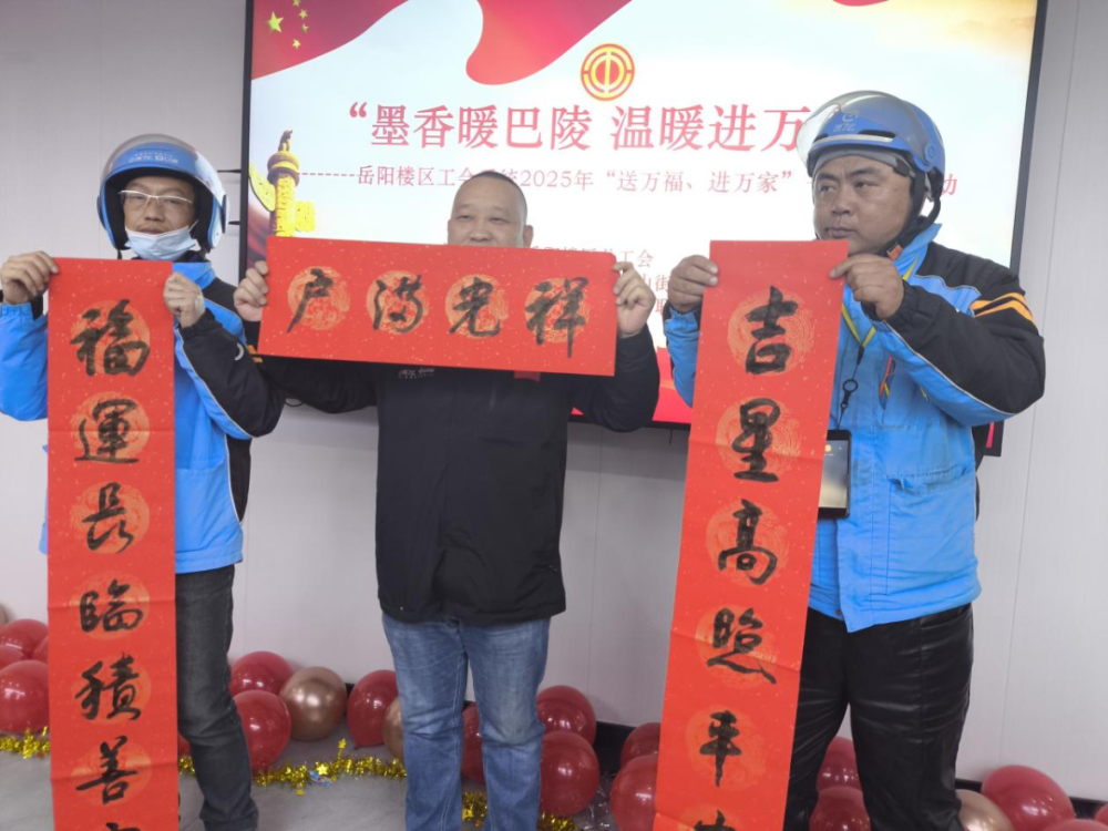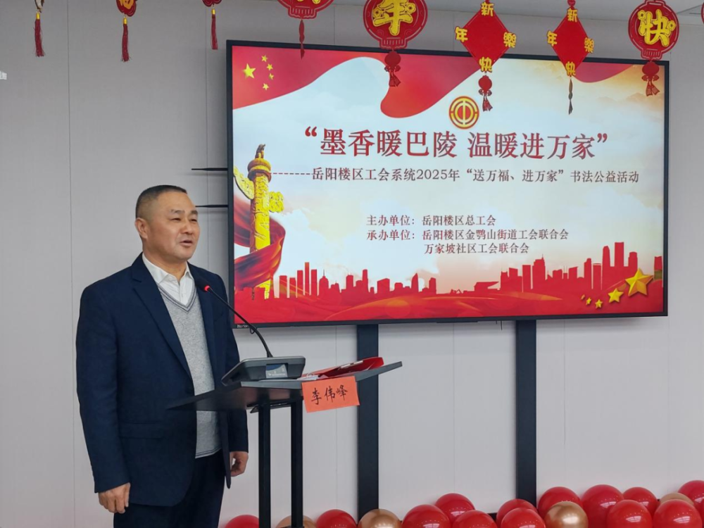为弘扬中华优秀传统文化,传递工会组织的温暖与关怀,1月22日,岳阳楼区工会系统举办了“墨香暖巴陵 • 温暖进万家”——2025年“送万福、进万家”书法公益活动,白尊贤、郭振斌、向伟雄、刘传汉、雷桂云、姚启舸、骆岳梨、谌亚忠、王如松等老领导、书法家,区委常委、统战部长、区总工会主席李伟峰等出席。