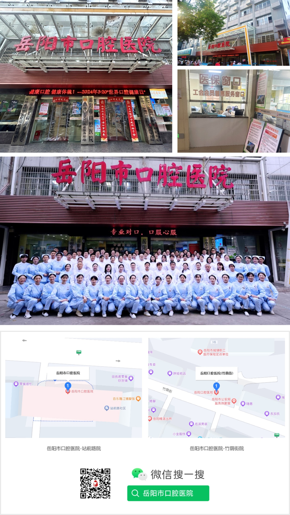 岳阳市口腔医院始建于1956年,经过六十多年的建设,现已成为一所集医疗、预防、教学为一体的二级公立口腔专科医院。目前是国家卫健委儿童口腔疾病综合干预项目岳阳市唯一承办医院,湖南省口腔医院管理学会常委单位,湖南省口腔健康管理协会副主委单位,湖南省卫计委设立的口腔健康教育基地,武汉大学口腔医院医联体成员单位,中南大学湘雅口腔医院定点指导医院,湖南省口腔专科联盟成员单位,岳阳市口腔医疗质量控制中心挂靠单位,岳阳市牙病防治办公室挂靠单位。岳阳市首批职工医疗保险门诊共济服务协议的定点医疗机构和岳阳楼区首家工会会员普惠医疗服务基地。