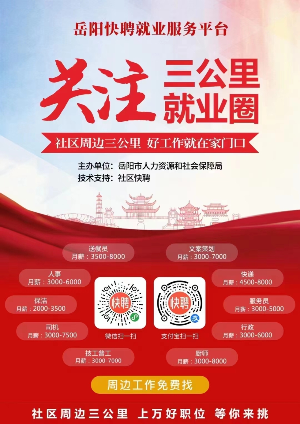 “岳阳快聘”平台,是岳阳市人社部门唯一指定的市级政府公共就业信息平台,免费为广大求职者和用工主体提供精准、高效、便捷的公共就业服务,实现“一刻钟”家门口就业服务圈。