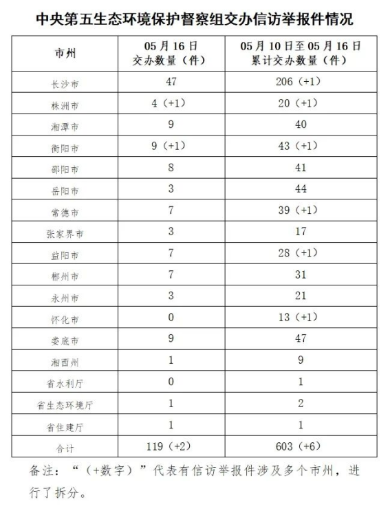 中央第五生态环境保护督察组今天向湖南交办群众信访举报件119件(来电举报63件,来信举报56件),其中重点件5件。我省分解后交办121件,其中重点件5件。