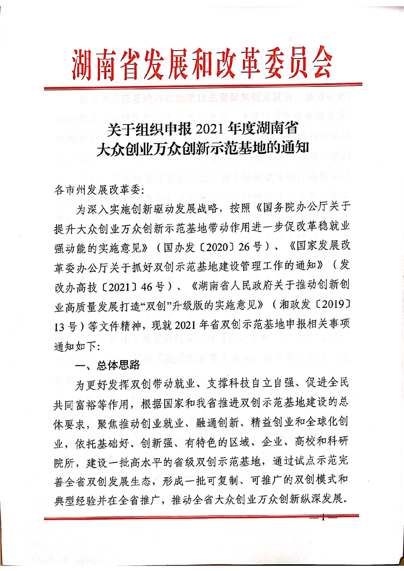 关于组织申报2021年度湖南省大众创业万众创新示范基地的通知
