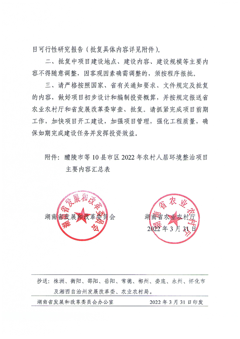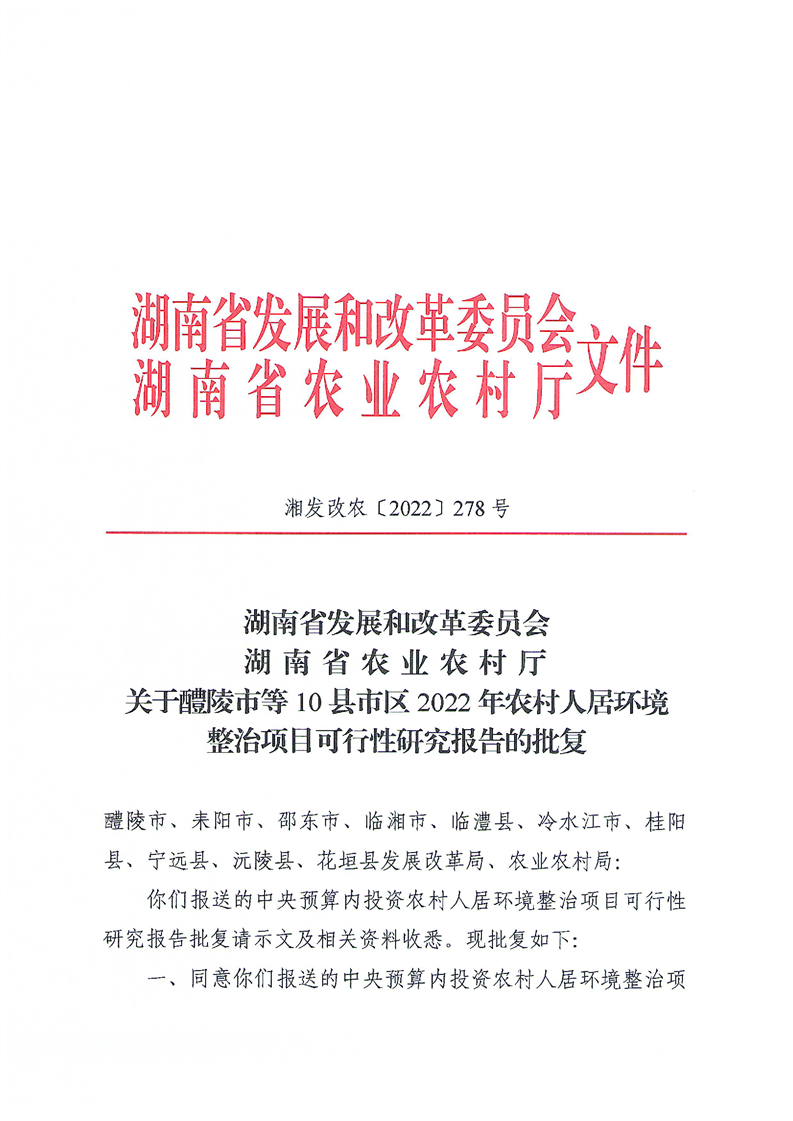 关于醴陵市等10县市区2022年农村人居环境整治项目可行性研究报告的批复