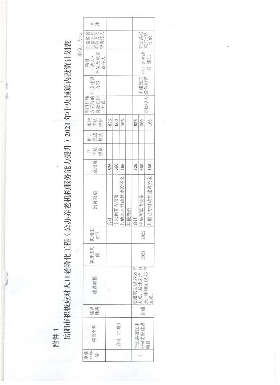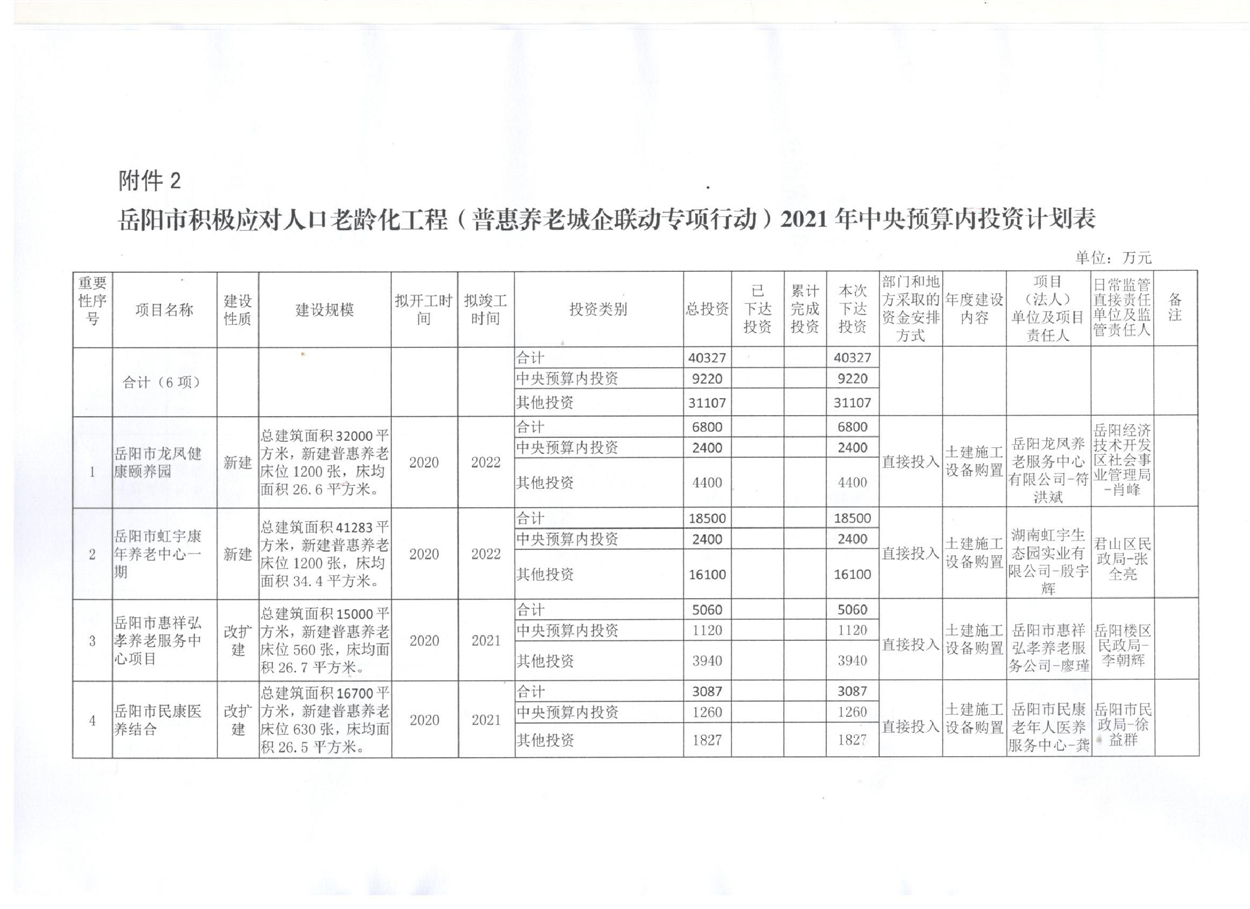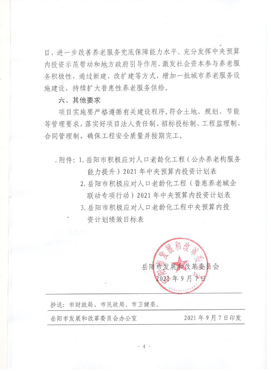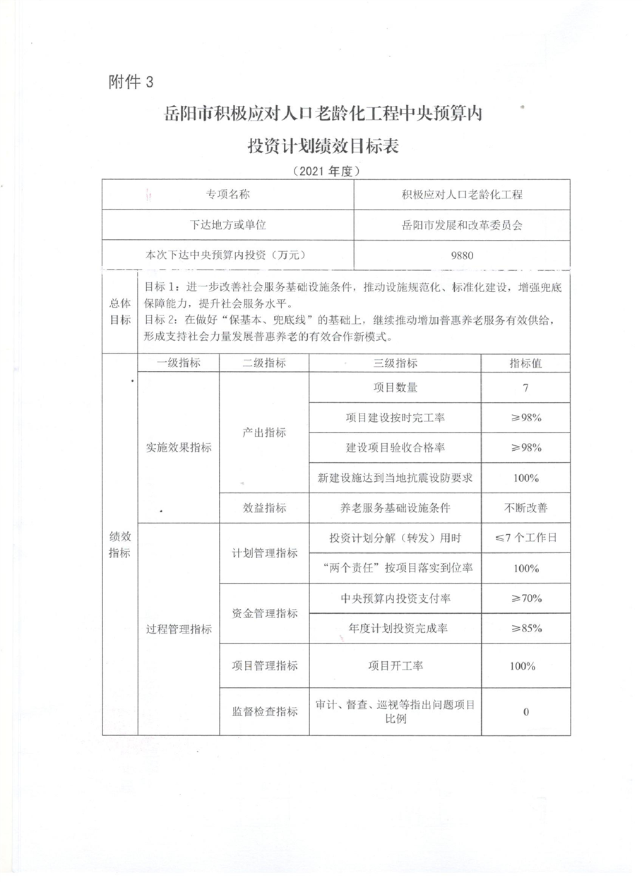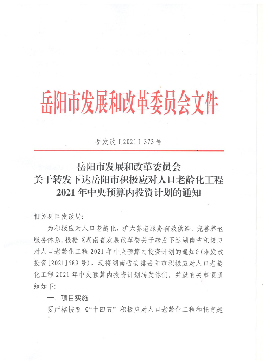 关于转发下达岳阳市积极应对人口老龄化工程2021年中央预算内投资计划的通知