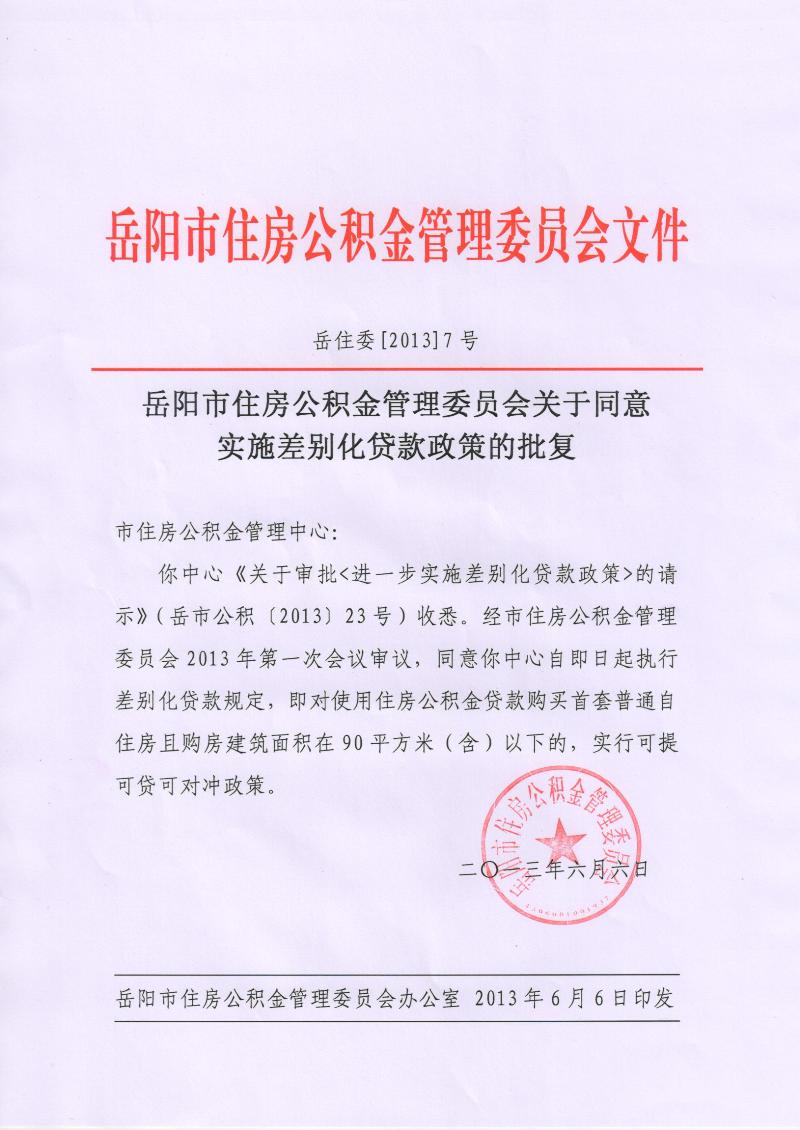 岳阳市住房公积金管理委员会关于同意实施差别化贷款政策的批复
