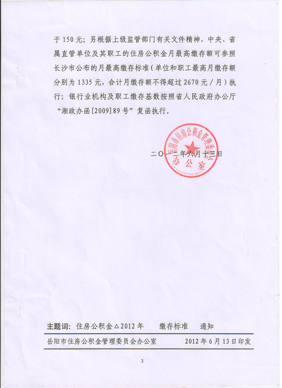 关于发布2012年度岳阳市住房公积金缴存标准的通知