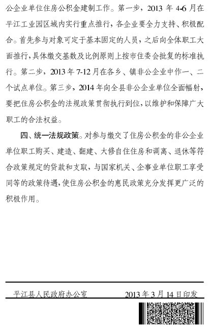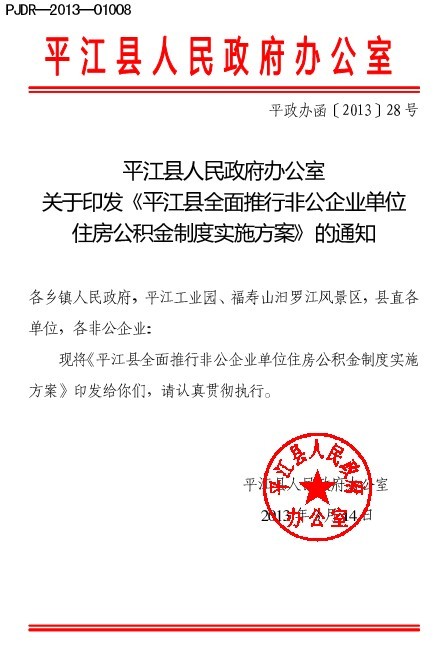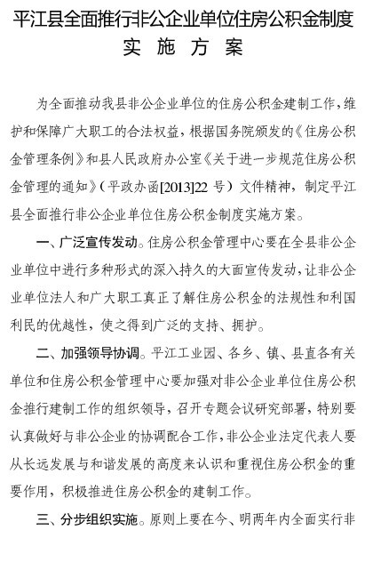 平江县政府办关于印发《平江县全面推行非公企业单位住房公积金制度实施方案》的通知