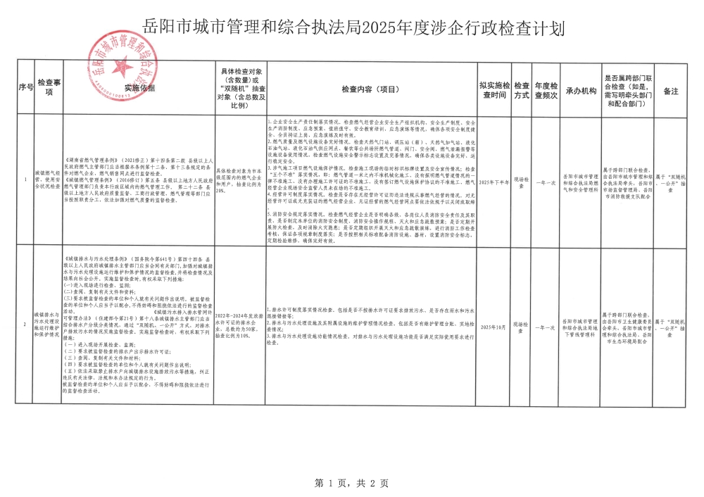 岳阳市城市管理和综合执法局2025年度涉企行政检查计划