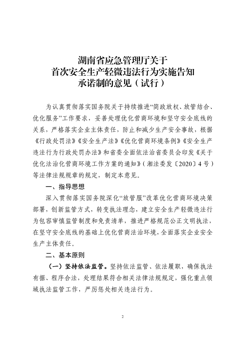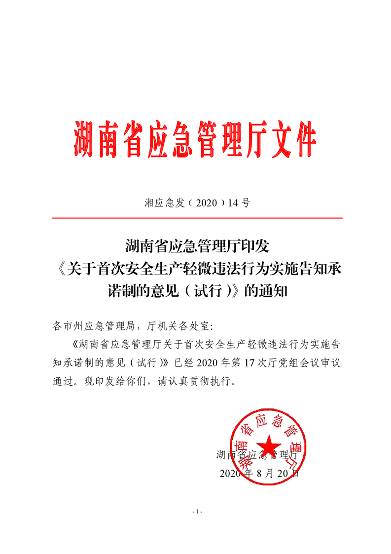 湖南省应急厅《关于首次安全生产轻微违法行为实施告知承诺制的意见(试行)》的通知