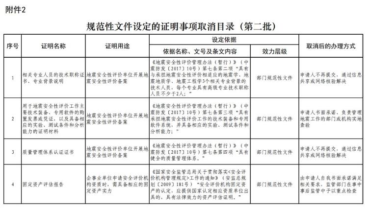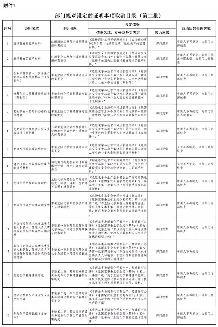 为贯彻落实党中央、国务院关于减证便民、优化服务的部署要求,根据《国务院办公厅关于做好证明事项清理工作的通知》(国办发〔2018〕47号)精神,现将应急管理部第二批取消的15项由部门规章设定的证明事项、4项由规范性文件设定的证明事项(见附件)予以公布,自公告之日起停止执行。证明事项涉及的部门规章和规范性文件按程序修改后另行公布。
