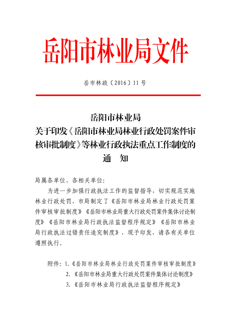 岳阳市林业局关于印发《岳阳市林业局林业行政处罚案件审核审批制度》等林业行政执法重点工作制度的通知