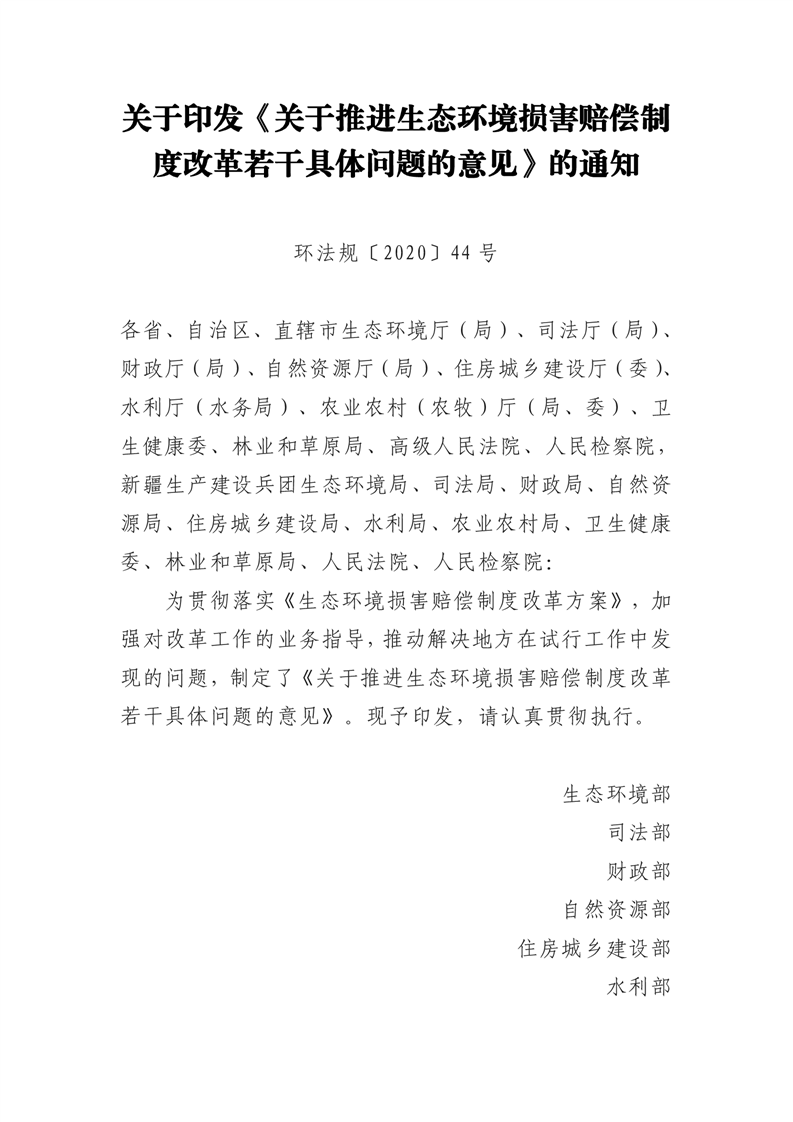 环法规(2020)44号关于印发《关于推进生态环境损害赔偿制度改革若干具体问题的意见》的通知