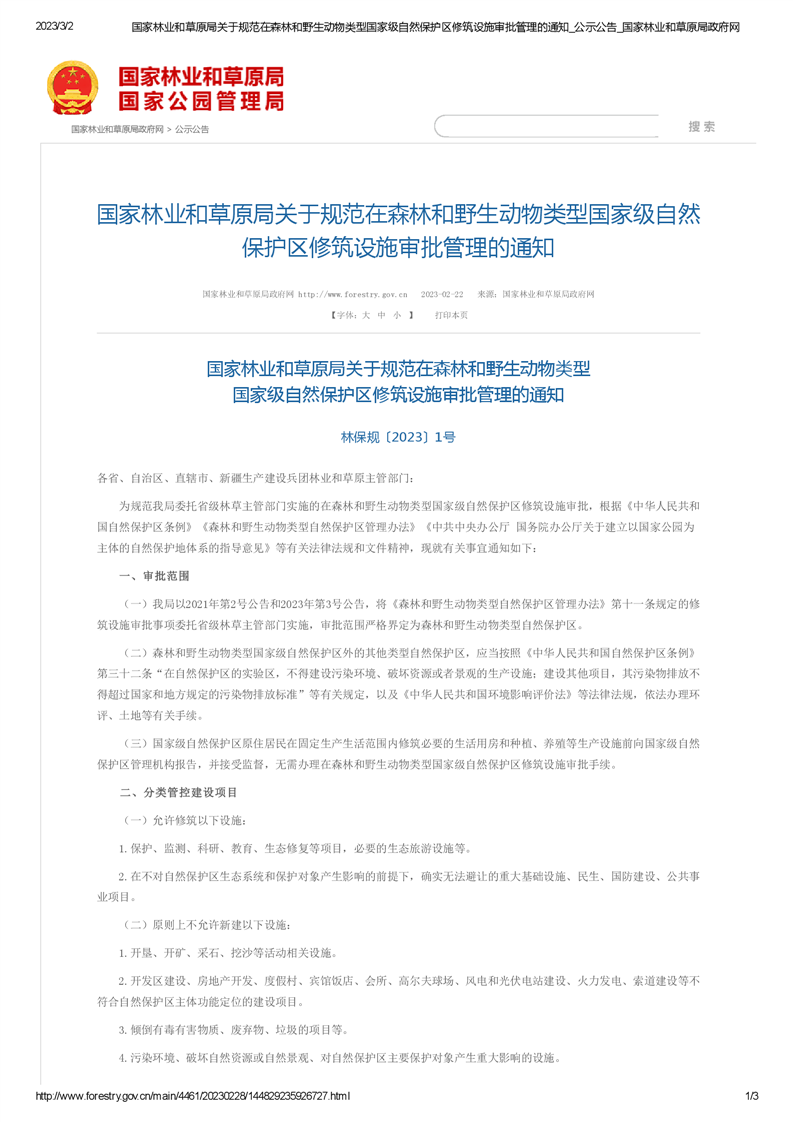 国家林业和草原局关于规范在森林和野生动物类型国家级自然保护区修筑设施审批管理的通知