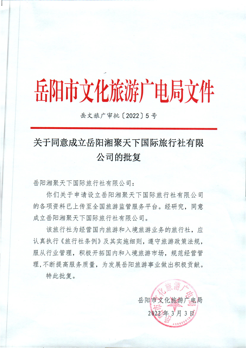 关于同意成立岳阳湘聚天下国际旅行社有限公司的批复