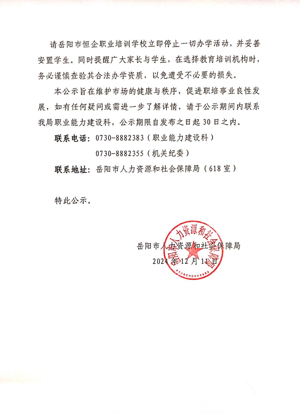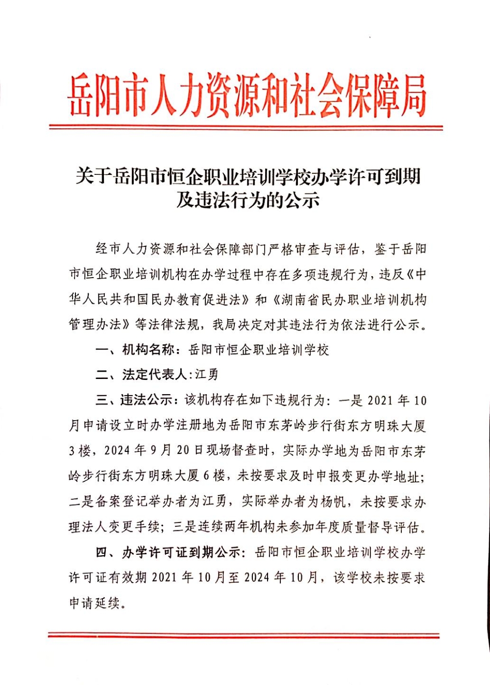 关于岳阳市恒企职业培训学校办学许可到期及违法行为的公示