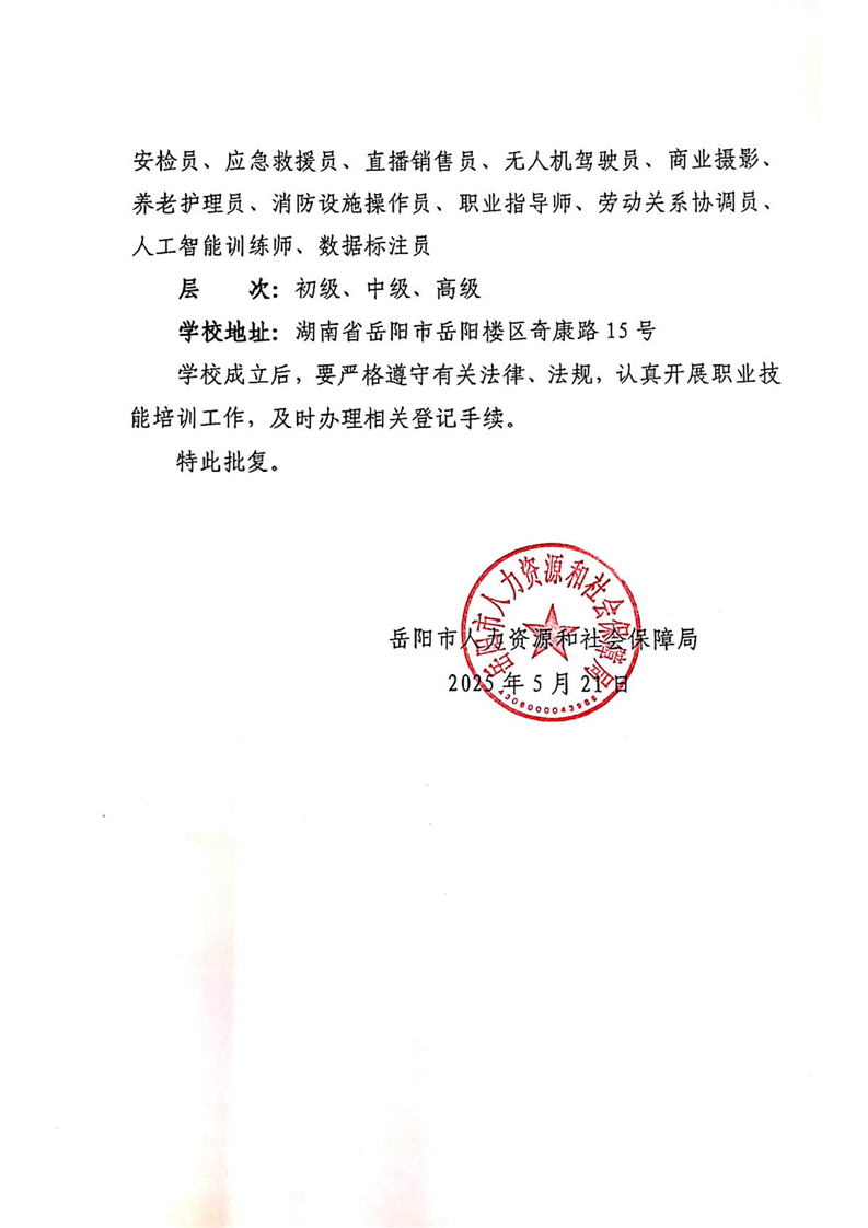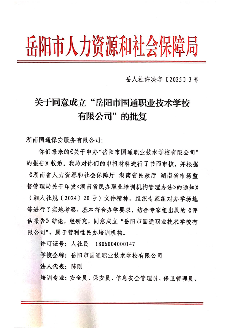 关于同意成立“岳阳市国通职业技术学校有限公司”的批复