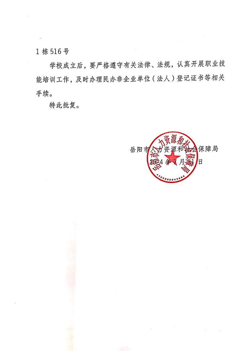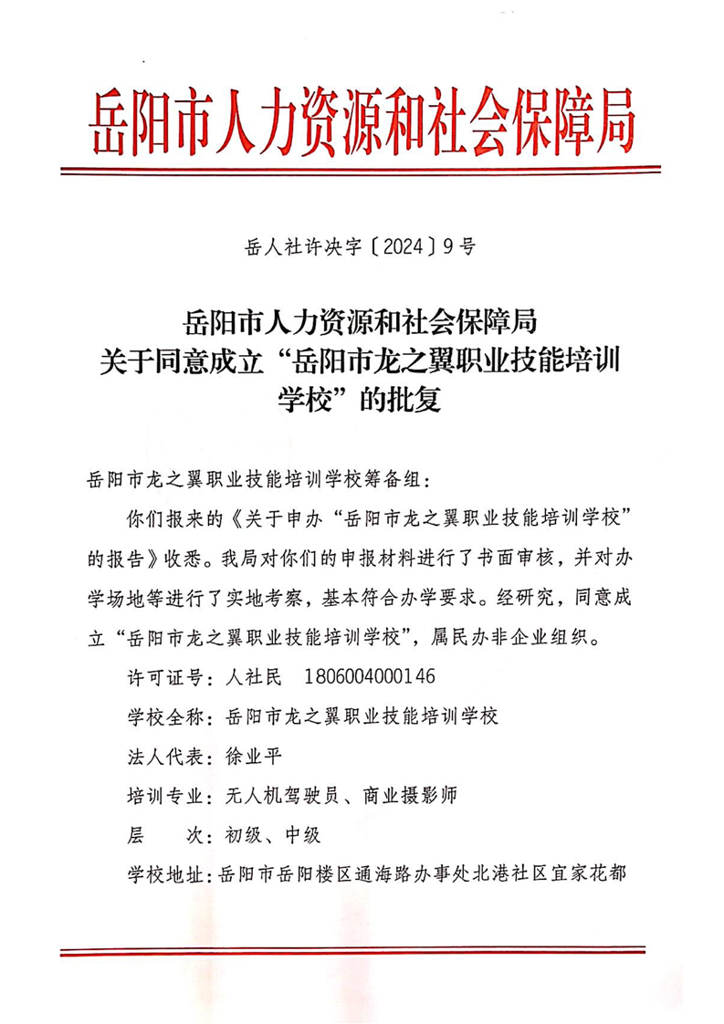 关于同意成立“岳阳市龙之翼职业技能培训学校”的批复