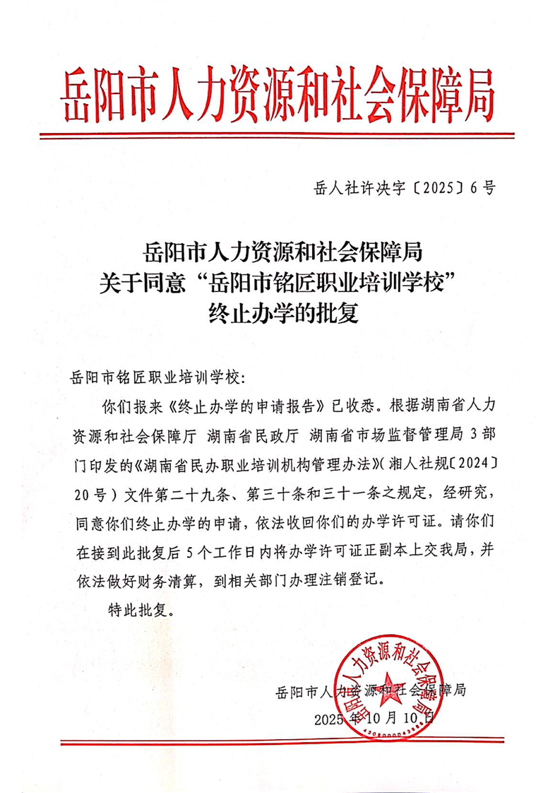 关于同意“岳阳市铭匠职业培训学校”终止办学的批复