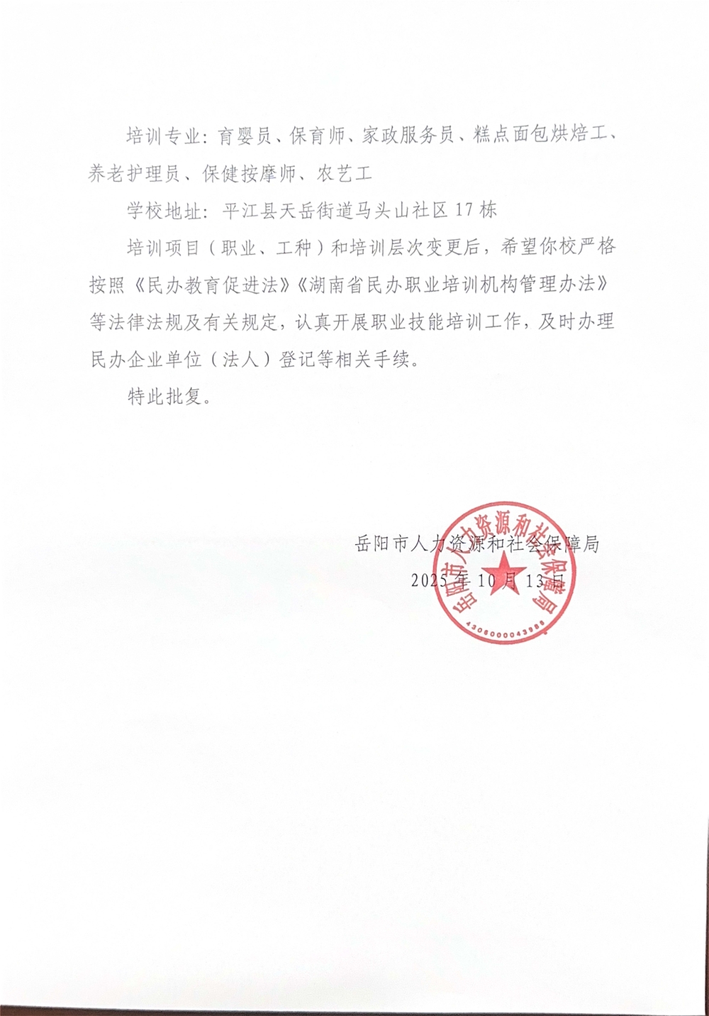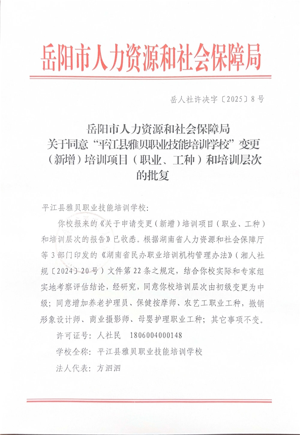 关于同意“平江县雅贝职业技能培训学校”变更(新增)培训项目(职业、工种)和培训层次的批复