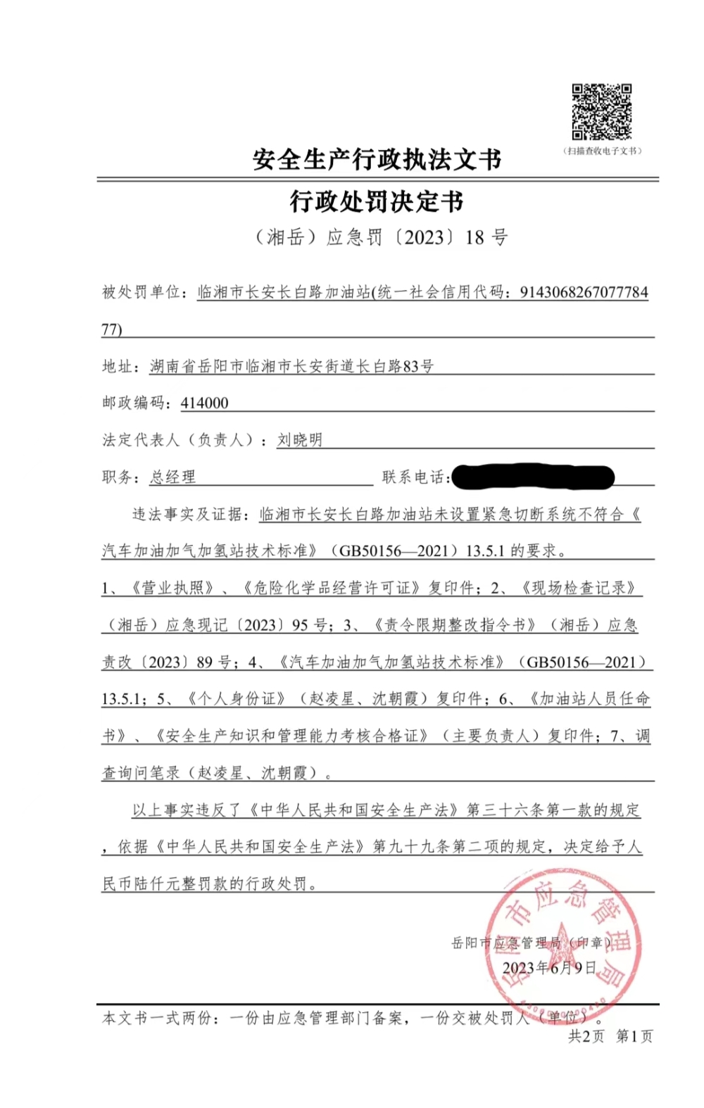 临湘市长安长白路加油站行政处罚决定书