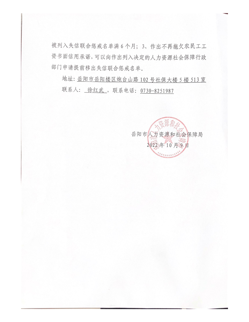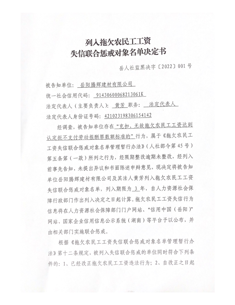 列入拖欠农民工工资失信联合惩戒对象名单决定书 岳人社监黑决字[2022]001号