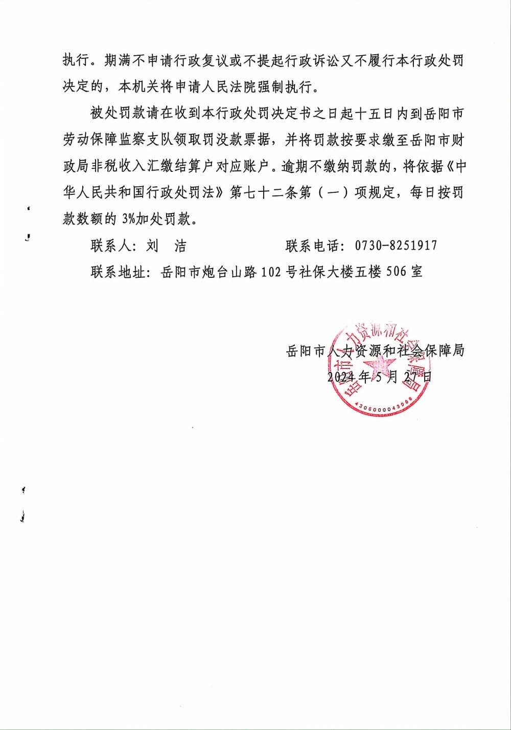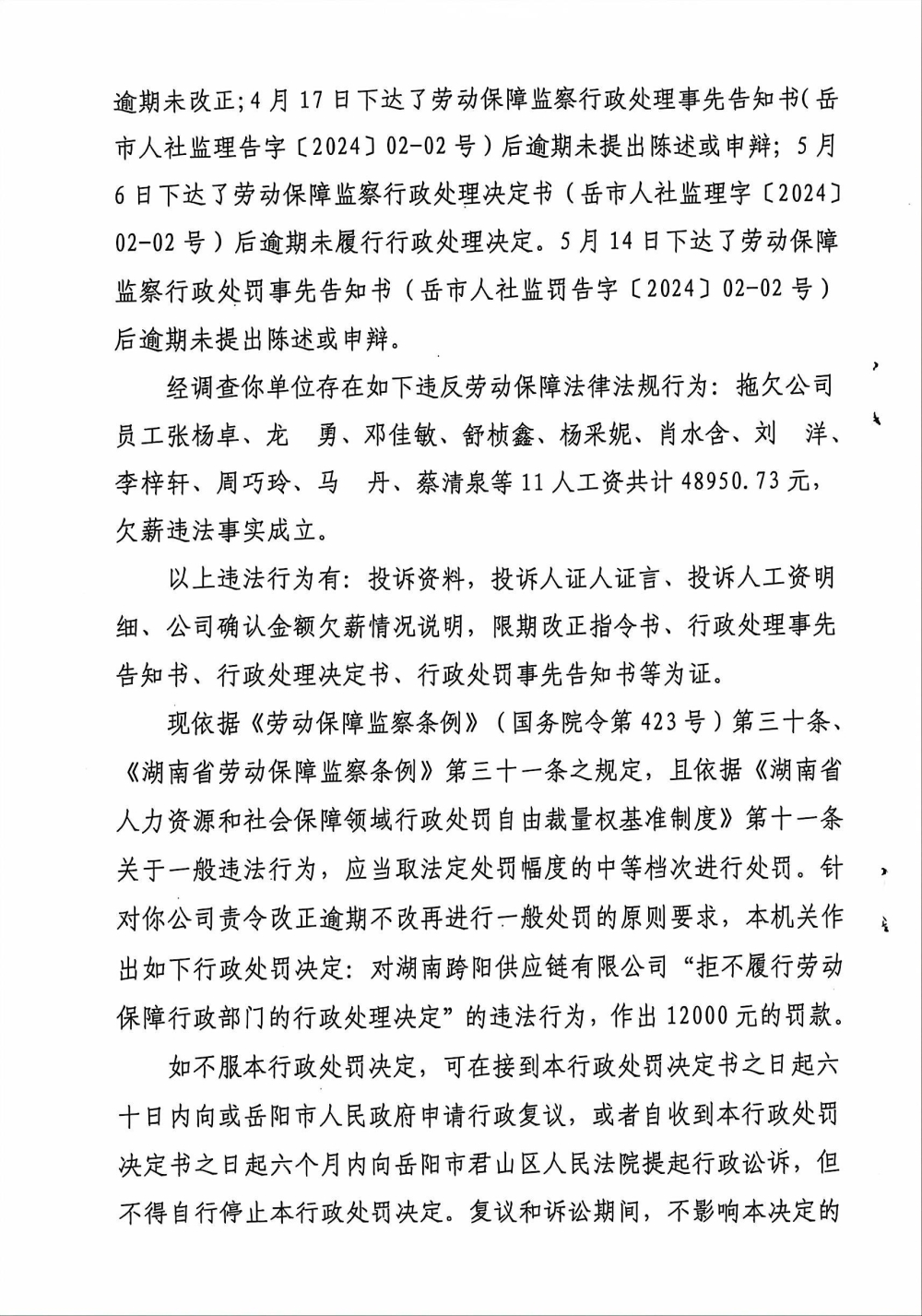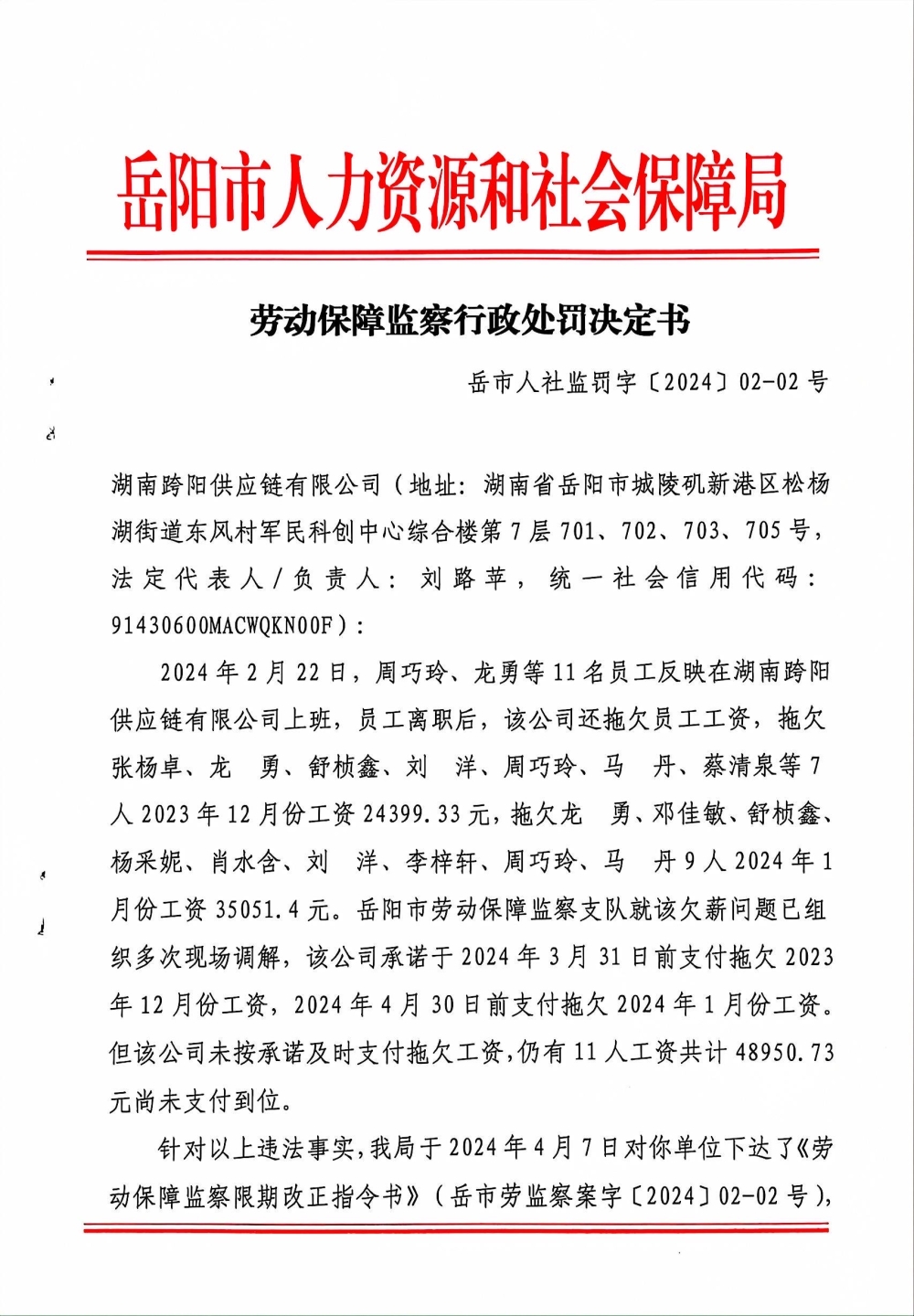 劳动保障监察行政处罚决定书 岳市人社监罚字[2024]02-02号