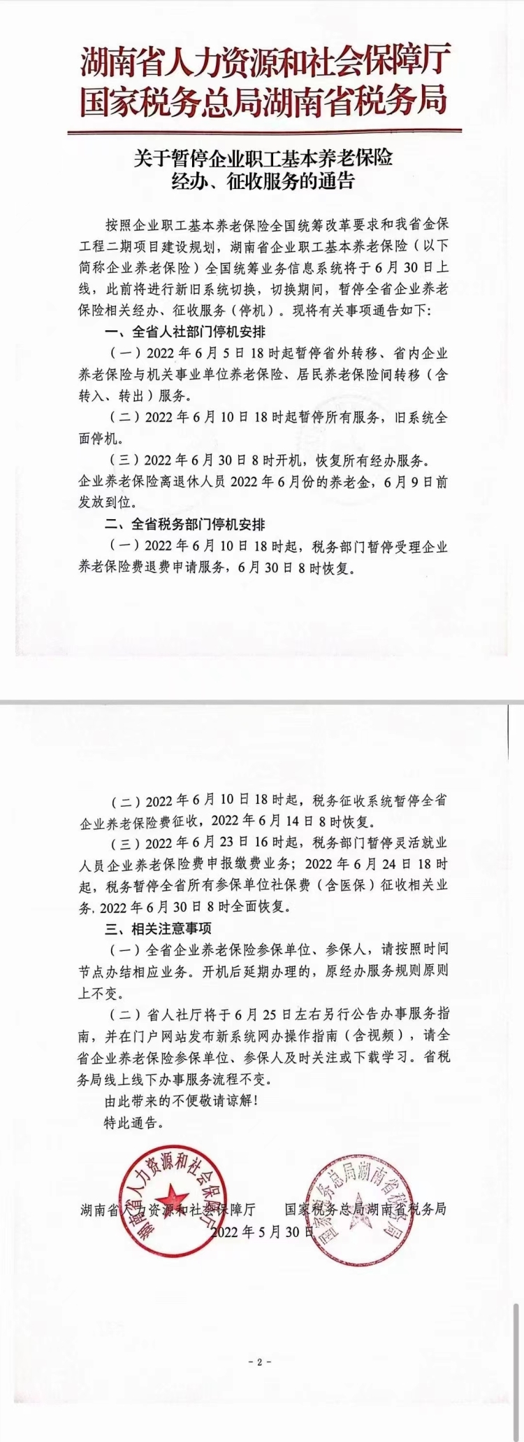 关于暂停企业职工基本养老保险经办、征收服务的通告