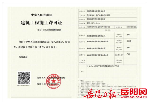 “在疫情期间,公司办理的地下施工工程许可证的从网上平台上传资料到领证,仅仅只用了3天的时间,大大缩短了项目开工时间。”4月11日,市住建局为天伦湖与树地产项目颁出全省首张线上正负零以下分阶段施工许可证。