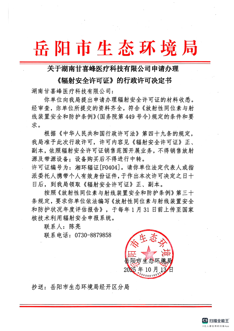 关于湖南甘喜峰医疗科技有限公司申请办理《辐射许可证》的行政许可决定