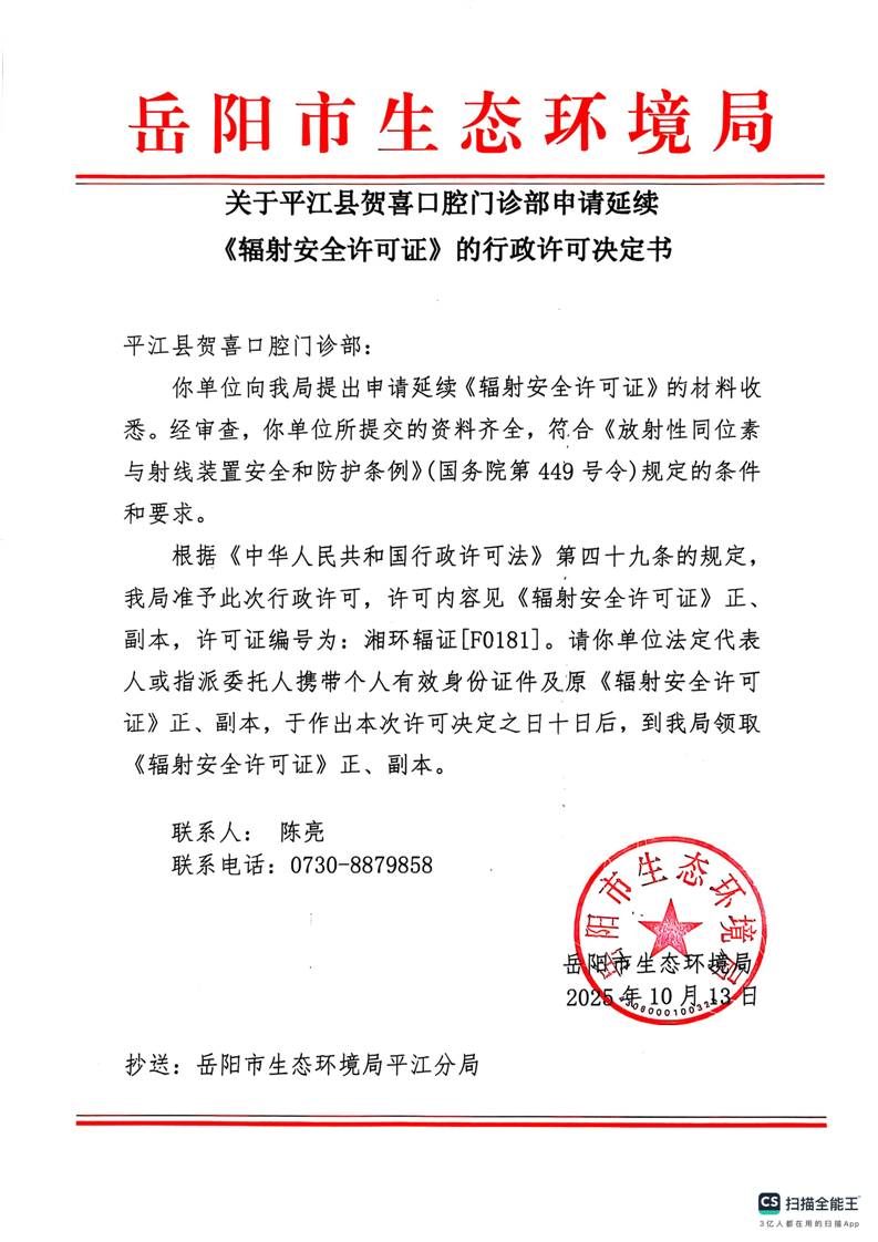 关于平江县贺喜口腔医门诊部申请延续《辐射许可证》的行政许可决定