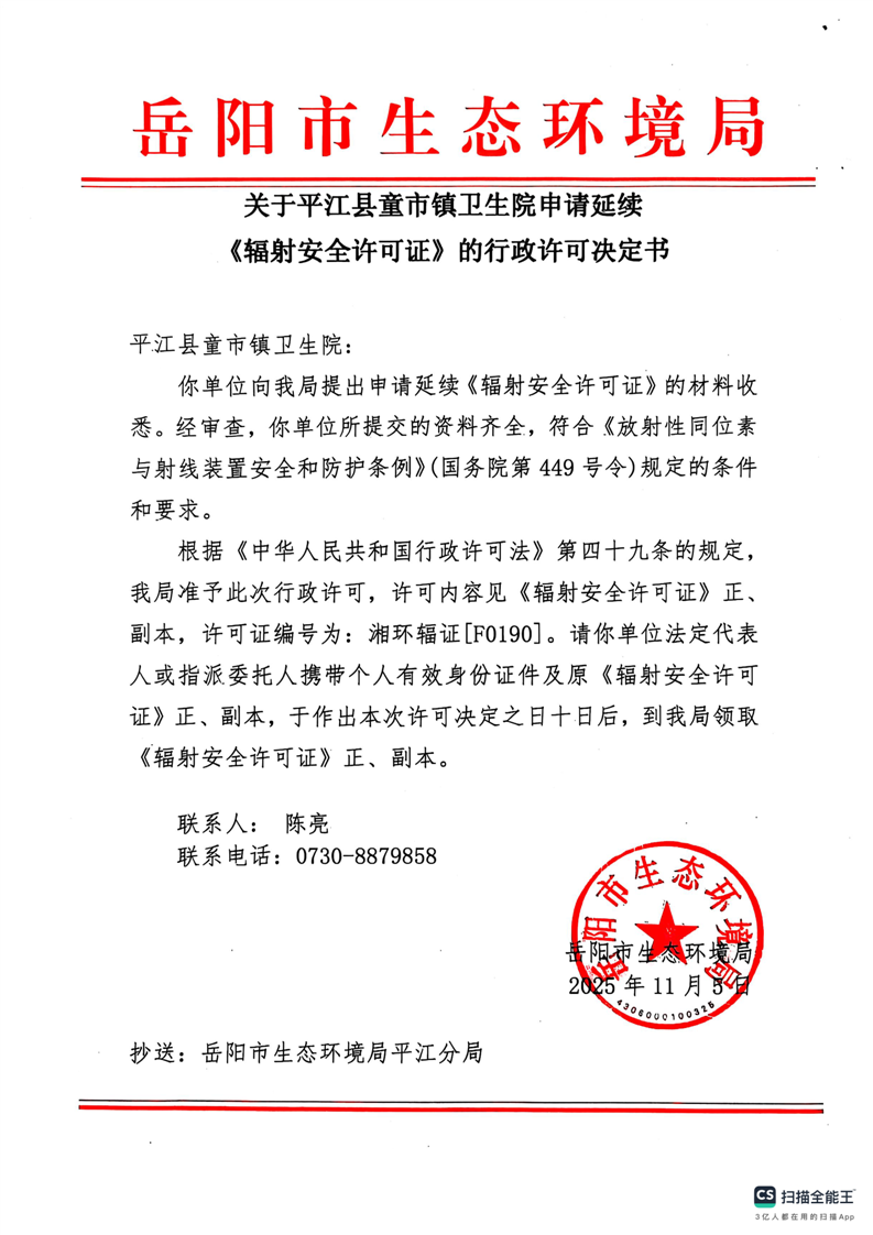 关于平江县童市镇卫生院申请延续《辐射安全许可证》的行政许可决定