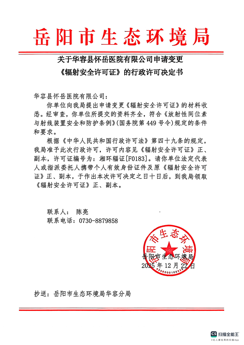 关于华容县怀岳医院有限公司申请变更《辐射安全许可证》的行政许可决定