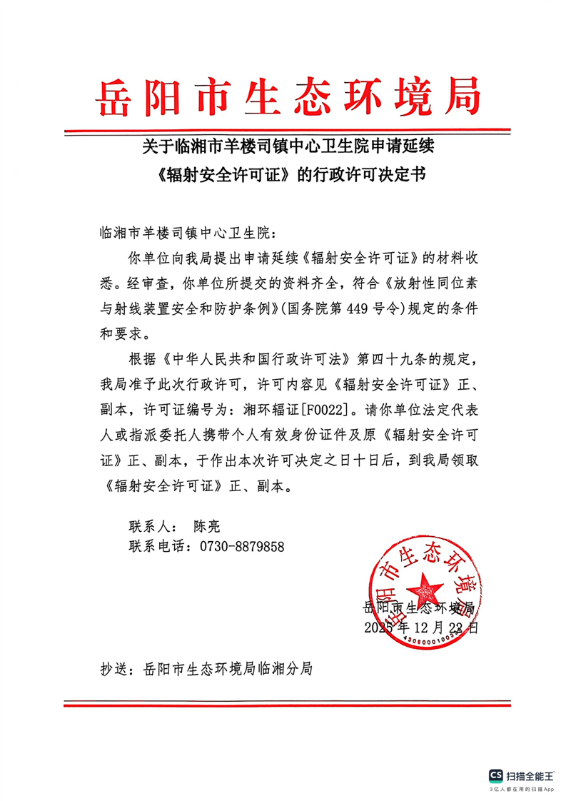 关于临湘市羊楼司镇中心卫生院申请延续《辐射安全许可证》的行政许可决定