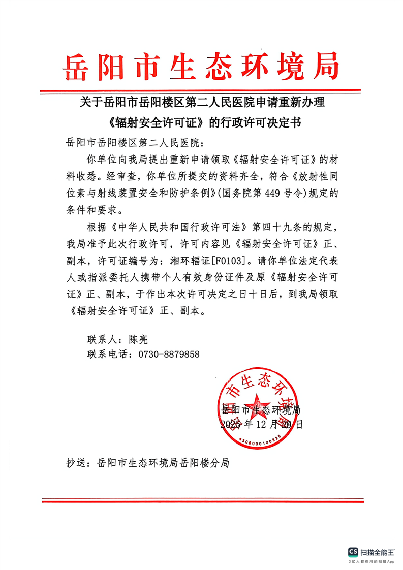 关于岳阳市岳阳楼区第二人民医院申请重新办理《辐射安全许可证》的行政许可决定