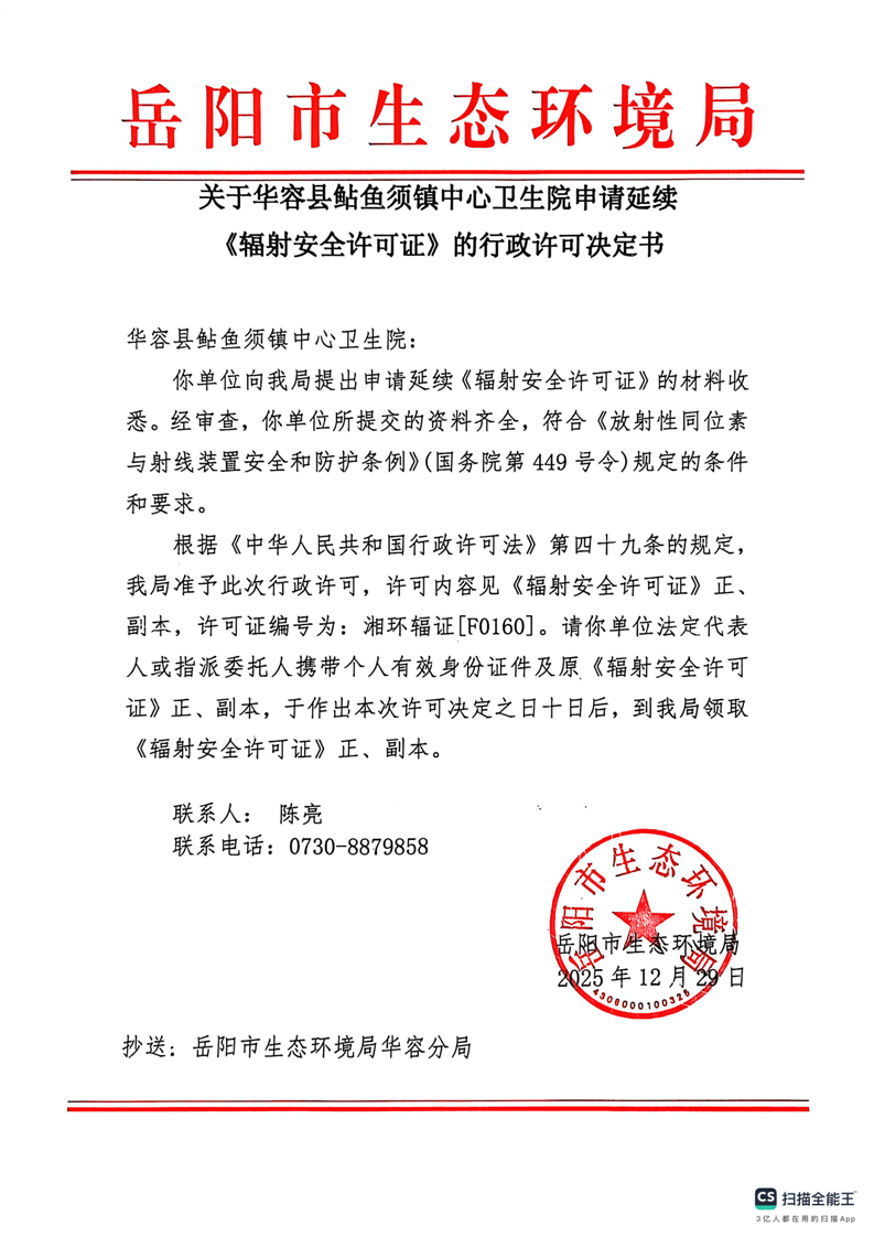 关于华容县鲇鱼须镇中心卫生院申请延续《辐射安全许可证》的行政许可决定