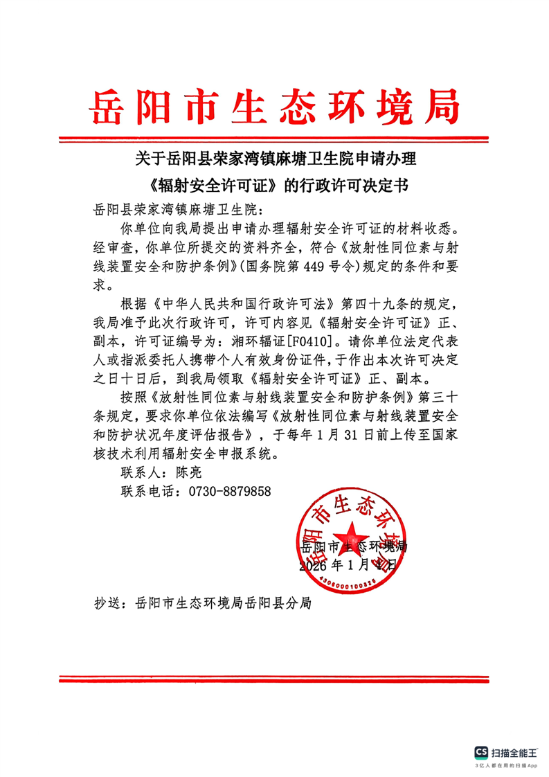 关于岳阳县荣家湾镇麻塘卫生院申请办理《辐射安全许可证》的行政许可决定