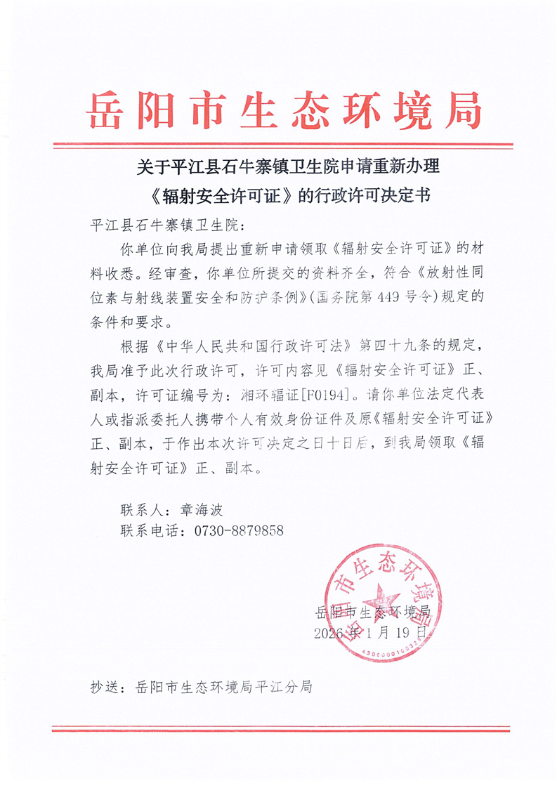 关于平江县石牛寨镇卫生院申请重新办理辐射安全许可证》的行政许可决定