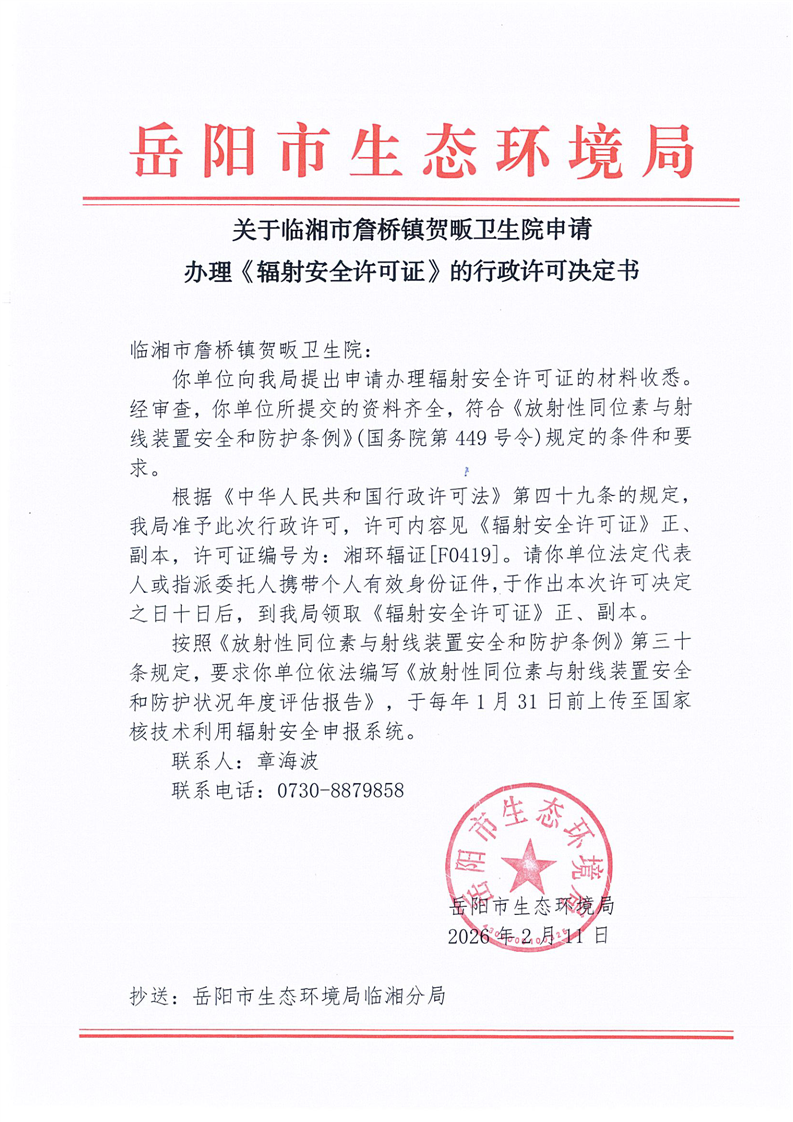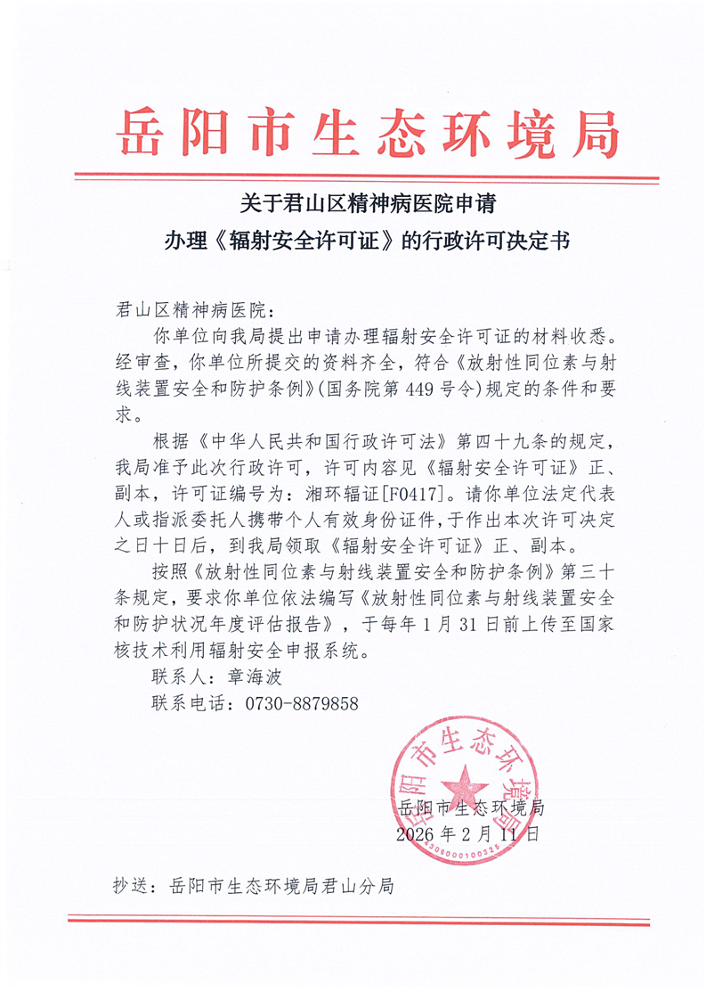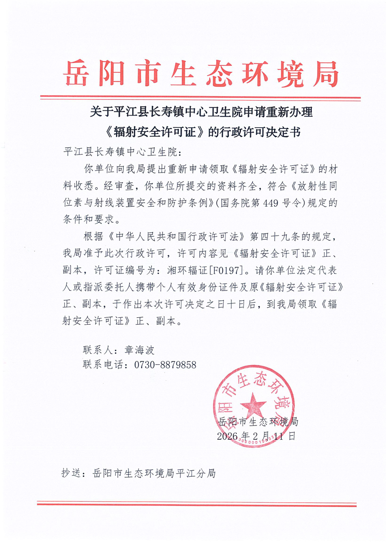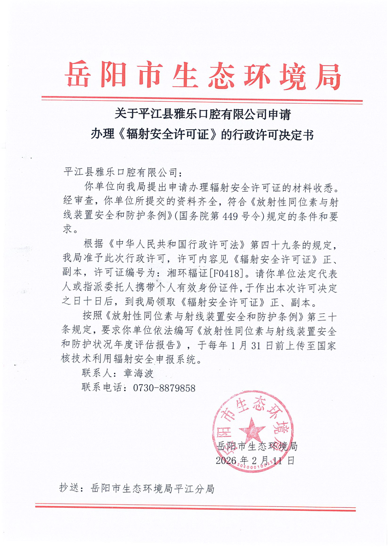 关于平江县雅乐口腔有限公司申请 办理《辐射安全许可证》的行政许可决定