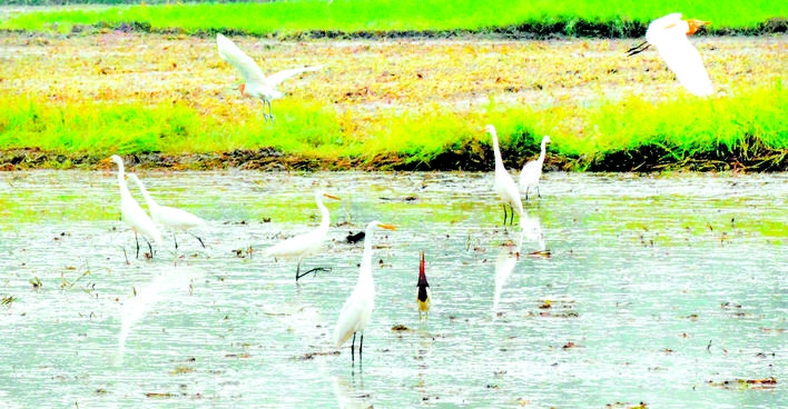 近日,经开区西塘镇西塘社区杨家组一丘水田里飞来近千只鹭鸟,一群群白鹭围着耕田的农民上下翻飞,自由觅食。田野、耕夫、白鹭,组成了一幅人与自然和谐的乡村美景。