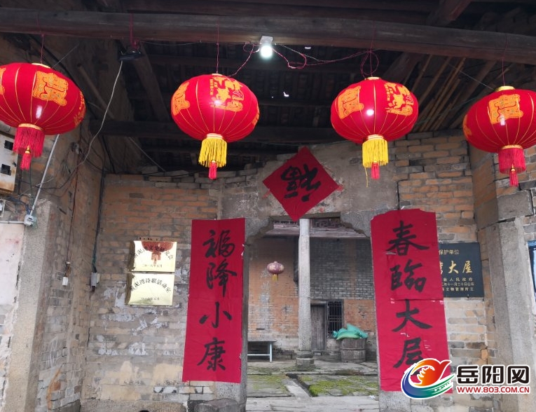 屋场的石质大门上,早已挂起四个大红灯笼,两边对联上写的是“春临大屋 福降小康“。