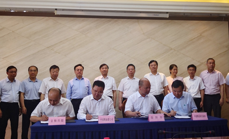 6月29日上午,我市在北京与中国储备粮管理集团有限公司(简称“中储粮集团”)、北京首农食品集团旗下海南京粮控股股份有限公司,签署中储粮岳阳油脂基地及岳阳直属库一体化项目建设落地协议。这标志着项目正式落户城陵矶新港区,即将进入开工建设阶段。市委书记刘和生,市委常委、市委秘书长谈正红,中储粮集团董事长邓亦武,北京首农食品集团董事长王国丰等见证签约。副市长邱虹、城陵矶新港区有关负责人和中储粮油脂有限公司负责人,分别代表各方签约。