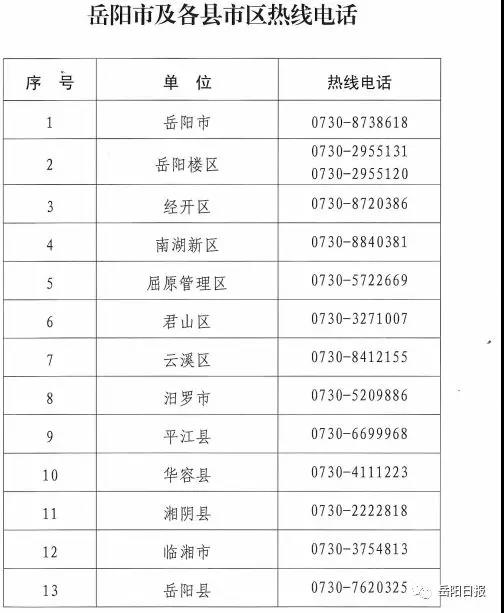 1月29日,岳阳市突发公共卫生事件应急指挥部公布岳阳市及各县市区疫情防控热线电话,要求各县市区务必严格按照通知要求抓好落实,主动关心群众,热心服务群众,切实发挥好热线电话在疫情防控中的重要作用。热线电话如下——