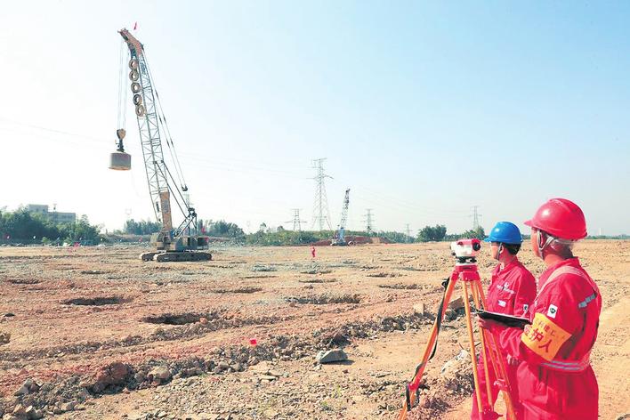 总投资为139.5亿元的巴陵石化己内酰胺产业链搬迁与升级转型发展项目,是中国石化和湖南省重点项目,预计2022年12月建成投产。图为11月10日,巴陵石化己内酰胺产业链搬迁与升级转型发展项目建设工地,中石化胜利建设工程公司人员进行地基(强夯)处理工程施工。该标段施工10月9日开工,预计工期120天。彭 展 摄