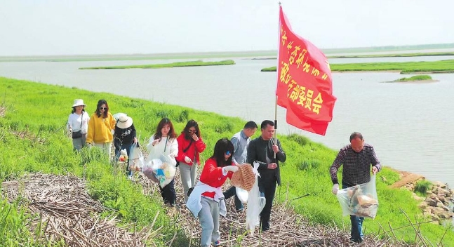 图为岳阳志愿者组织在长江边开展生态环保活动。