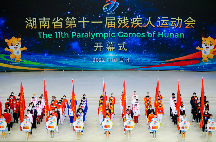 20时,在铿锵有力的《运动员进行曲》中,运动员、裁判员代表方阵步入运动场。入场式后,全场起立,高唱中华人民共和国国歌。在雄壮的国歌声中,五星红旗冉冉升起,迎风飘扬。伴随着湖南省第十一届残疾人运动会会歌的旋律,会场上升起了湖南省残疾人运动会会旗、湖南省第十一届残疾人运动会会旗。