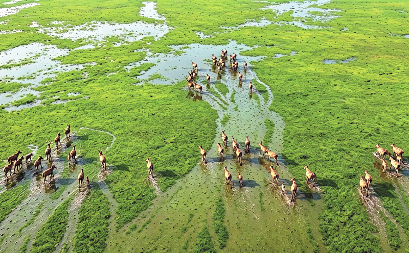 东洞庭湖国家级自然保护区内麋鹿奔腾。晏涛摄
