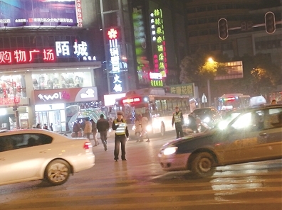 11月26日晚18时53分,步行街巴陵大桥十字路口,交警仍在车流中指挥交通