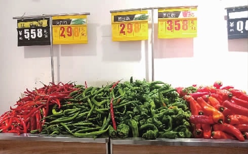 1月3日下午 在长沙市伍家岭某大型超市 市民正在选购蔬菜 菜价显示 湖南人最喜欢吃的辣椒价格每斤多在3元至3.5元左右 记者 陈月红 摄