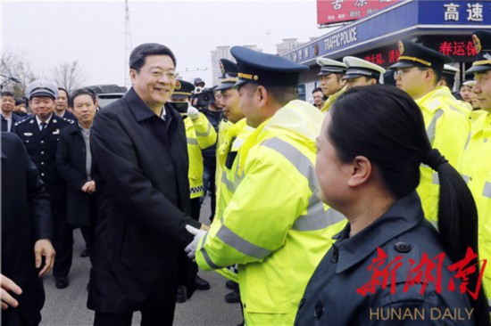 正值节前春运高峰,京港澳高速公路已是车轮滚滚,长沙火车南站日均客流量逼近10万人次。杜家毫先后来到京港澳高速雨花收费站和长沙火车南站,看望慰问值班执勤的公安民警、武警官兵、交通运输部门工作人员,以及高铁、地铁、磁浮工作人员和志愿者,实地检查春运交通运输组织和安保工作。杜家毫说,新春佳节万家团圆之际,就是大家任务最繁重之时。让人民群众平平安安、顺顺利利回家过年,始终是我们第一位的责任。希望大家再接再厉,做好春运期间各项工作,充分运用信息化手段,加强值班调度,做好预报预警,强化安全应急管理,为广大群众营造更加安全、便捷、舒适的出行环境。